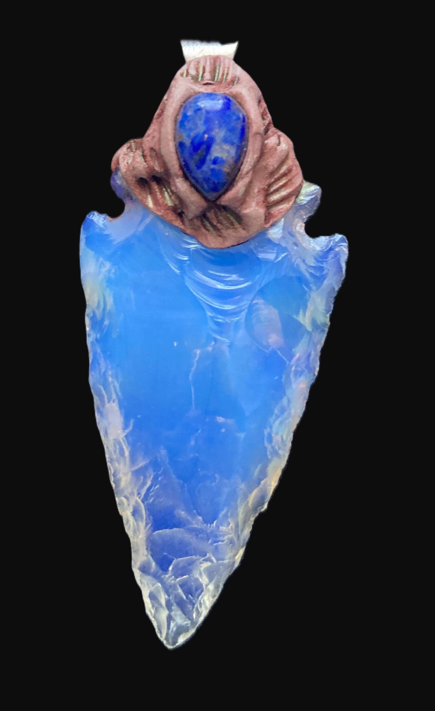 The question is it a pendant or pendulum - your choice. Wear it to give you strength or work with it to give you answers. This one is an 'Opalite' - strictly not a Crystal but hey ho it shines beautifully reflecting the colours against whatever you wear. It has has been fashioned into the shape of an arrow head with 1 Lapis Lazuli cabochon in its settings. It is approx 6cm in length including the fitting. It comes with a Black Cord in a Gift Box.