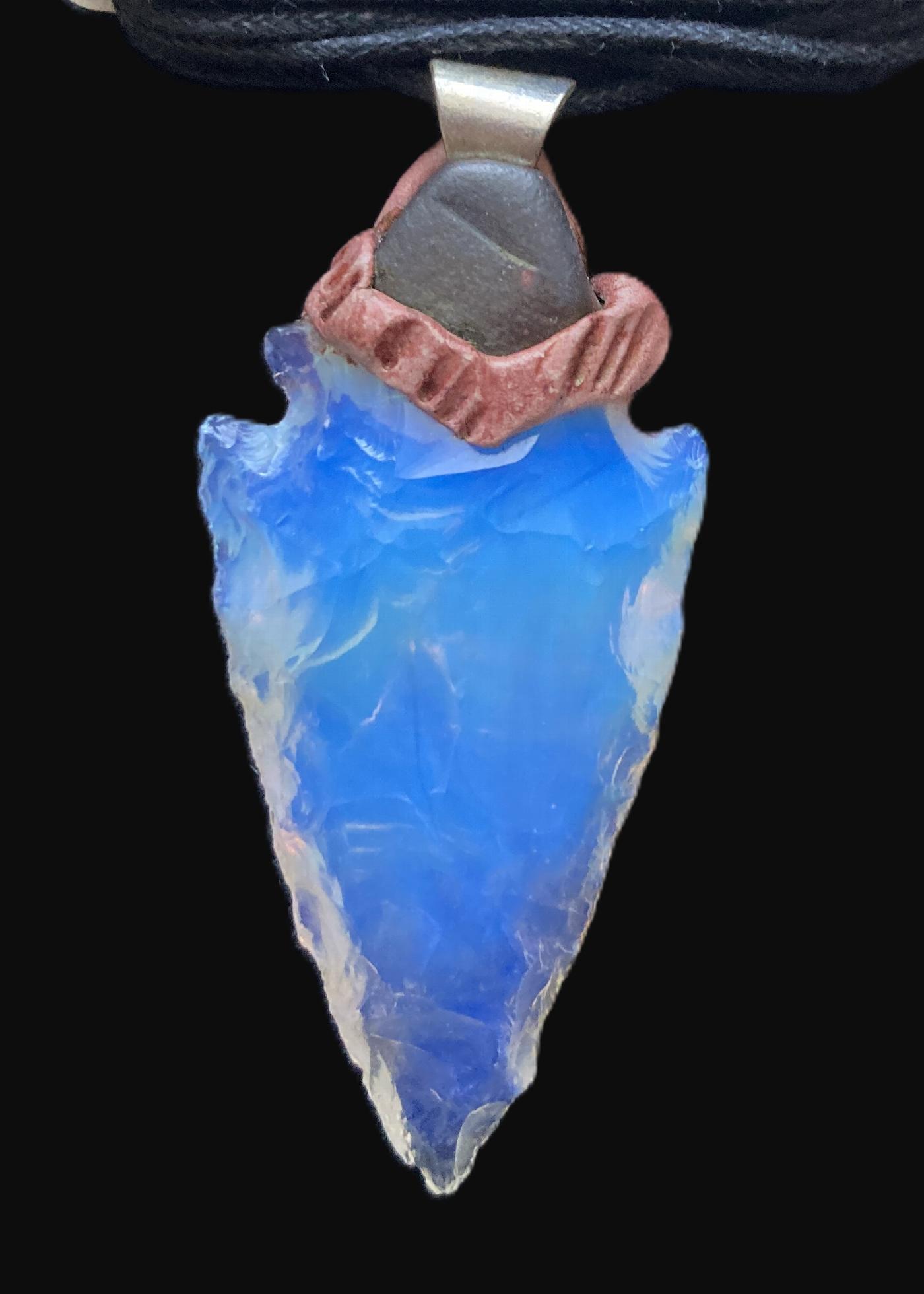 An Arrow Head Opalite and Lapis Lazuli Pendant with a Black Cord in a Gift Box.