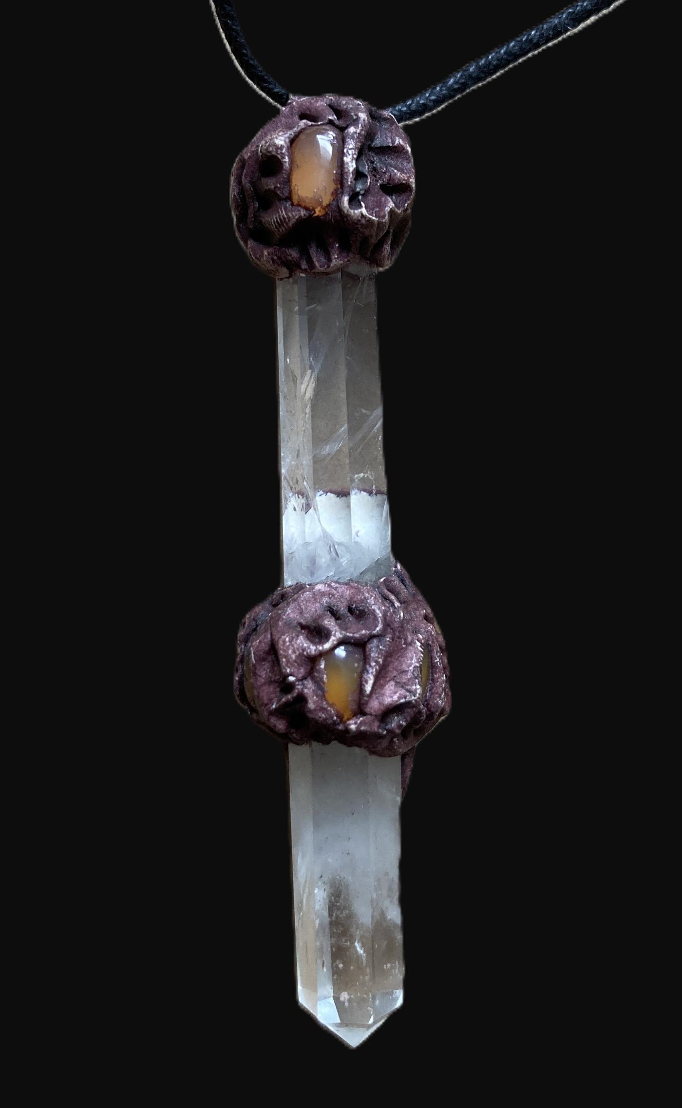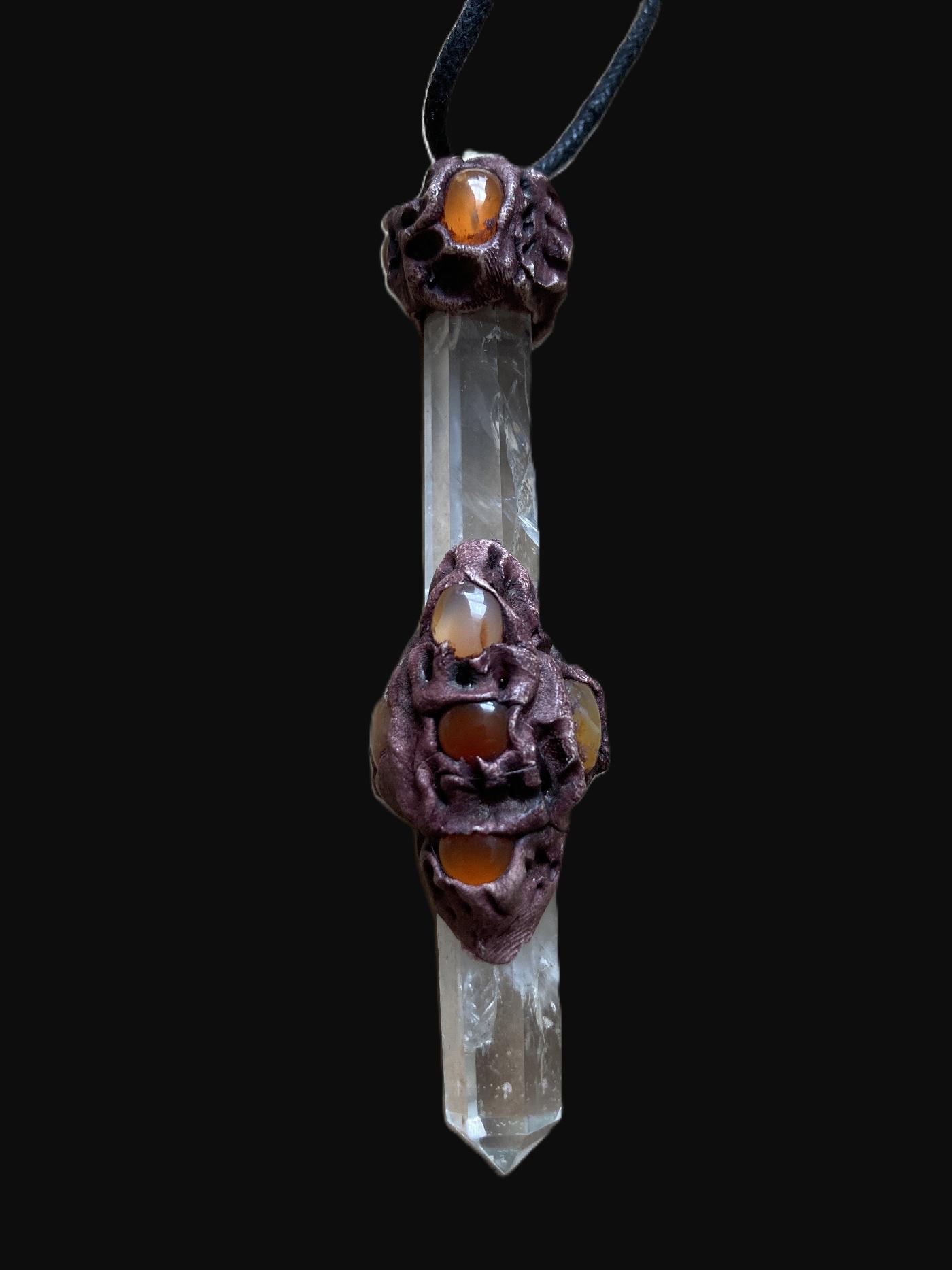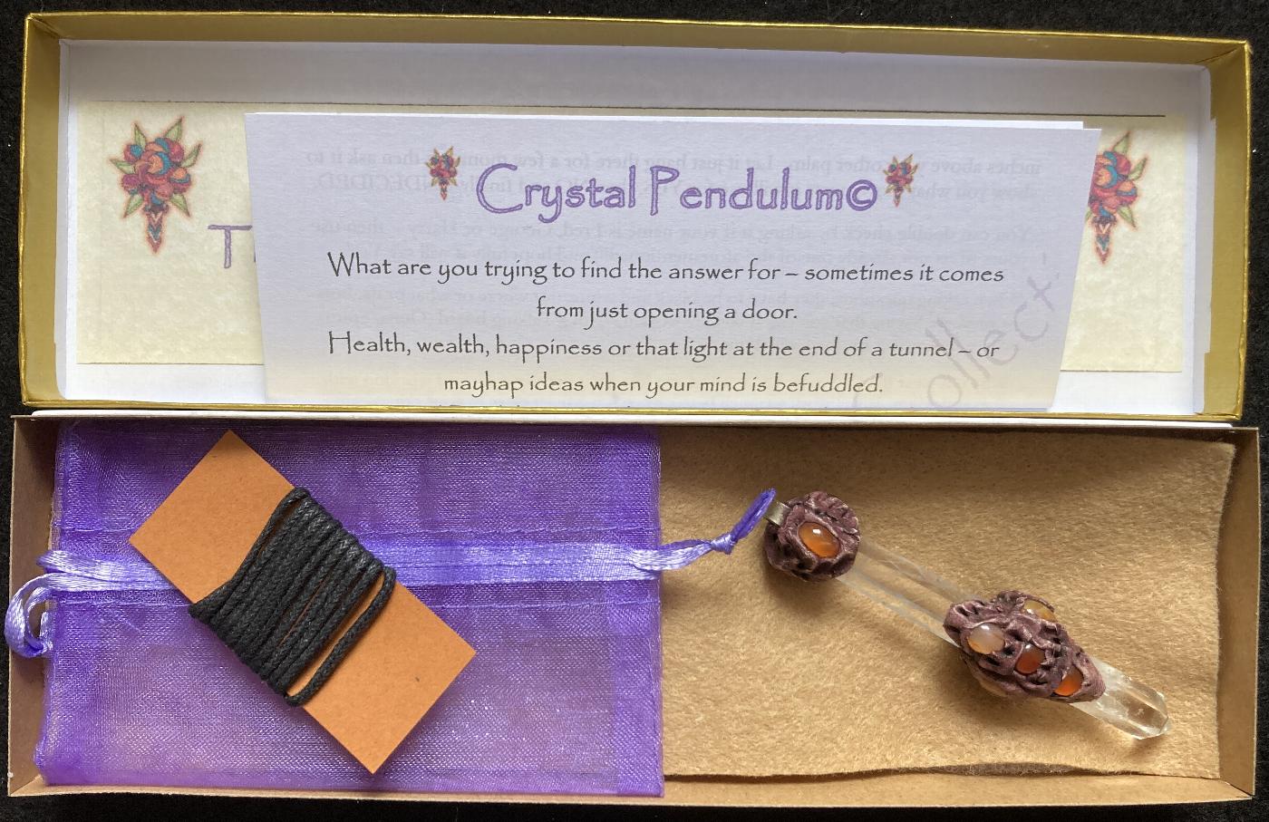 A Quartz and Carnelian Pendulum with a Black Cord, Organza Bag and Guidance in a Gift Box.