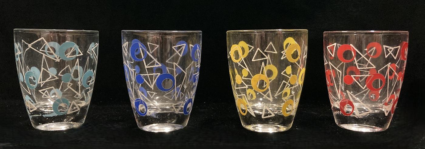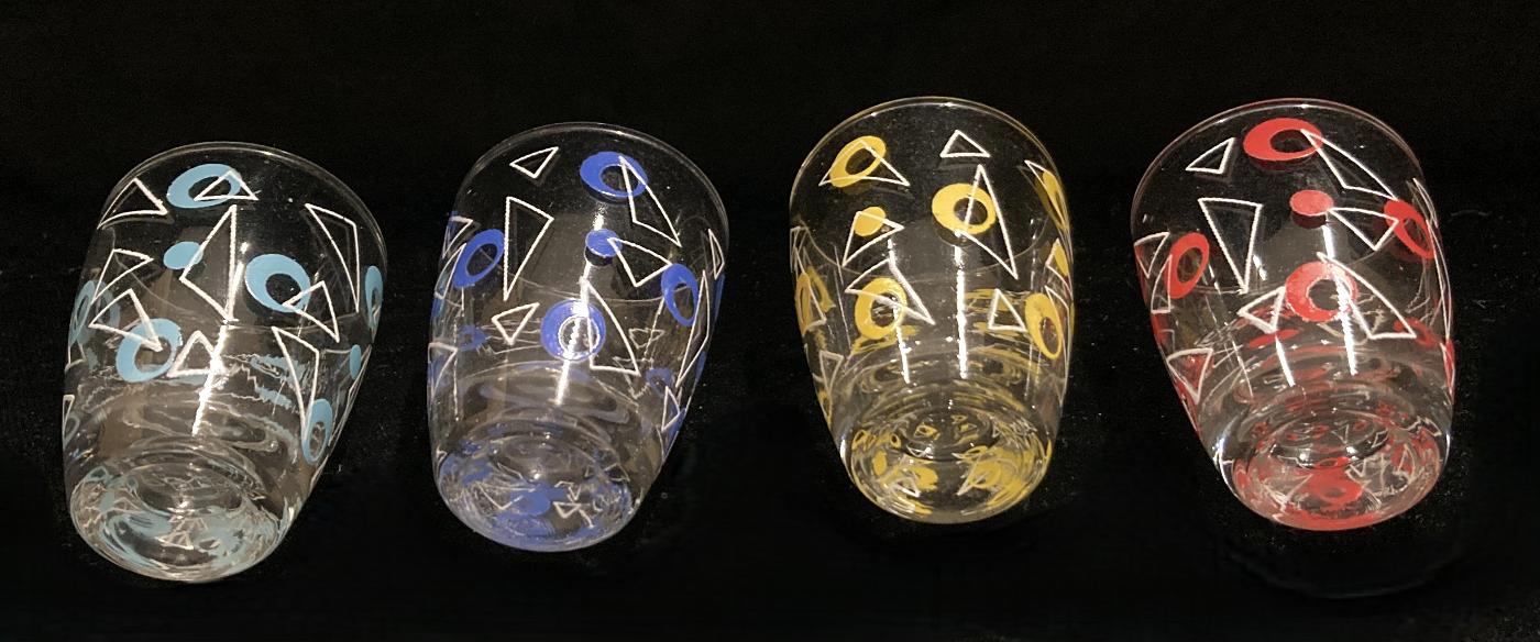 A beautiful set of four glasses, very colourful/vibrant. I doubt they have been used as the transfers are not worn, and I cannot find any chips or cracks in them, they have dimpled bottoms and are approx 5.5cm tall. There is a very slight mark in the one transfer circle of the yellow one, which is seriously not noticeable.